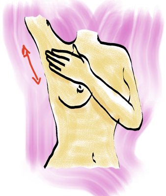 Continuez en remontant petit à petit jusqu’à votre aisselle en effectuant des lignes horizontales partant de l’aisselle jusqu’au sein. Pensez aussi à palper avec vos doigts l’intérieur de l’aisselle de haut en bas puis de bas en haut.